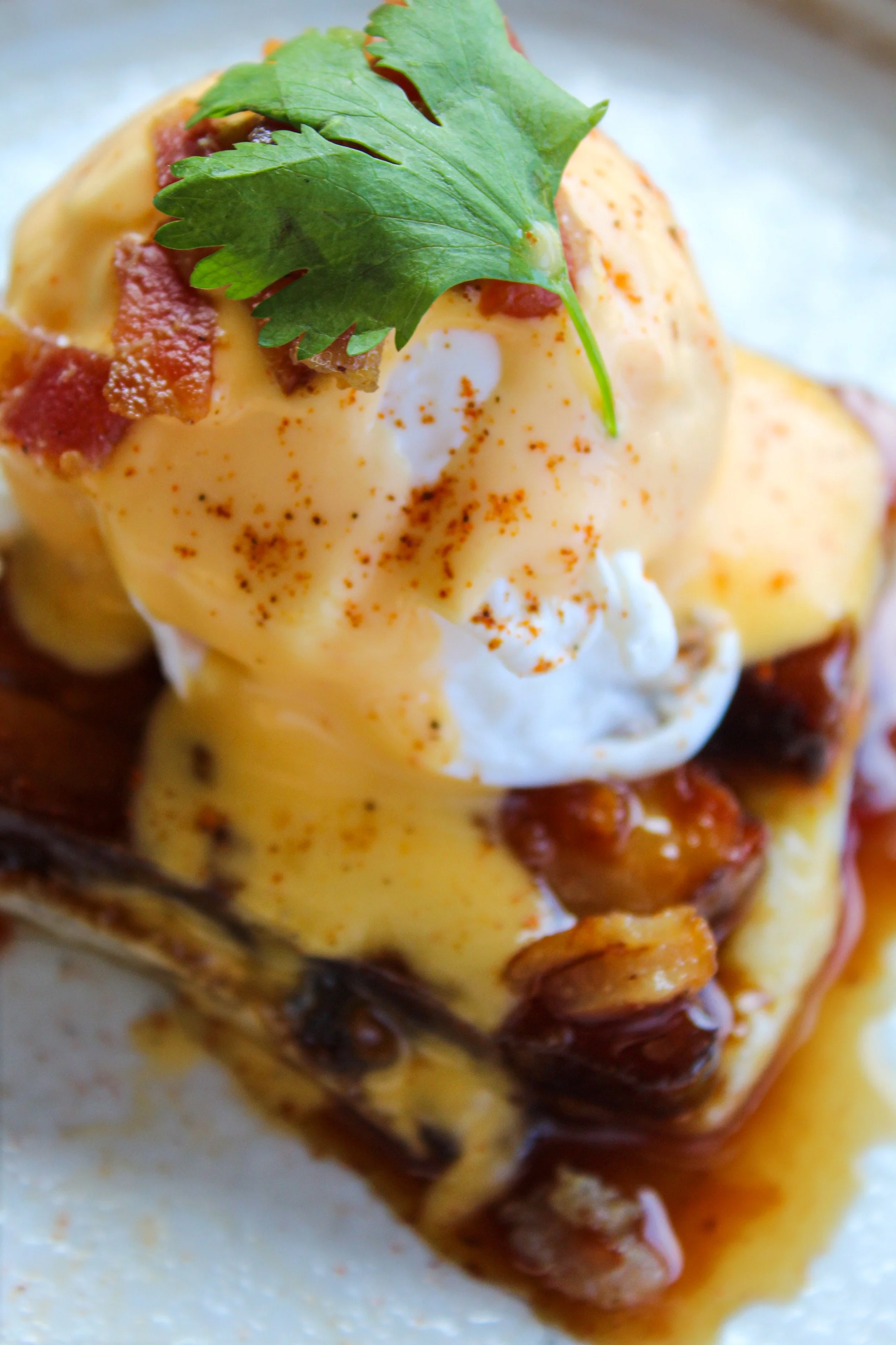 Close-up of Catch 110’s Pork Belly Benedict, featuring poached eggs, crispy pork belly, rich hollandaise sauce, and a fresh cilantro garnish