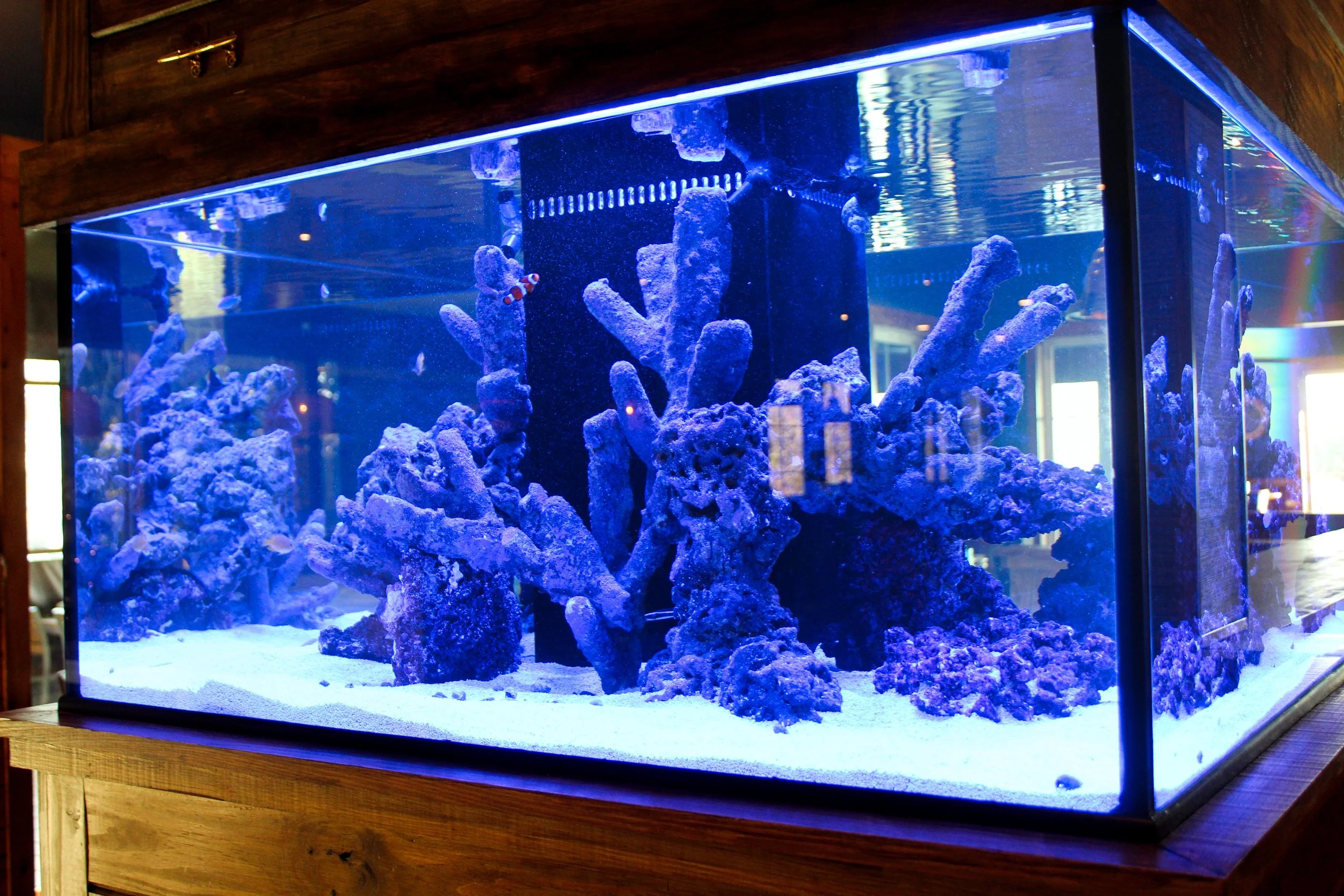 Coastal-inspired lounge and bar at Catch 110 in Biloxi with modern decor, backlit round mirror, and upscale seating for a relaxed dining experience.